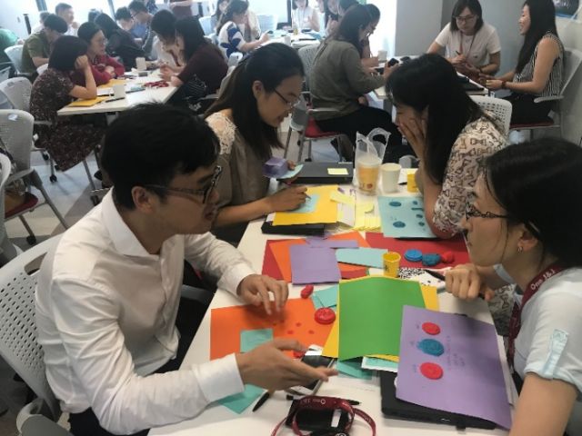 学员们动手制作原型,视觉反馈带来良好的用户体验。在这一环节,学员利用彩纸、画笔、黏土来快速制作原型,这种方式即保证创新的低风险、又能快速便捷地获得用户的反馈。
